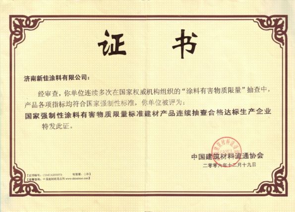 新佳涂料榮獲無毒害綠色建材稱號(hào)