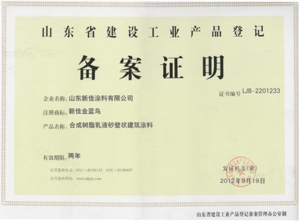 山東省建設(shè)工業(yè)品備案證 真石漆系列